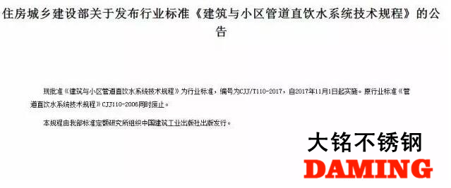此外,近期住房城鄉(xiāng)關(guān)于發(fā)布行業(yè)標(biāo)準(zhǔn)《建筑與小區(qū)管道直飲水系統(tǒng)技術(shù)規(guī)程》的公告:批準(zhǔn)《建筑與小區(qū)管道直飲水系統(tǒng)技術(shù)規(guī)程》為行業(yè)標(biāo)準(zhǔn),編號(hào)為CJJ/T110-2017,自2017年11月1日起實(shí)施。規(guī)程中規(guī)定:管材應(yīng)選用雨花區(qū)304不銹鋼薄壁水管、銅管等符合食品級(jí)要求的管材。一系列跡象表明,不銹鋼水管時(shí)代正在到來。